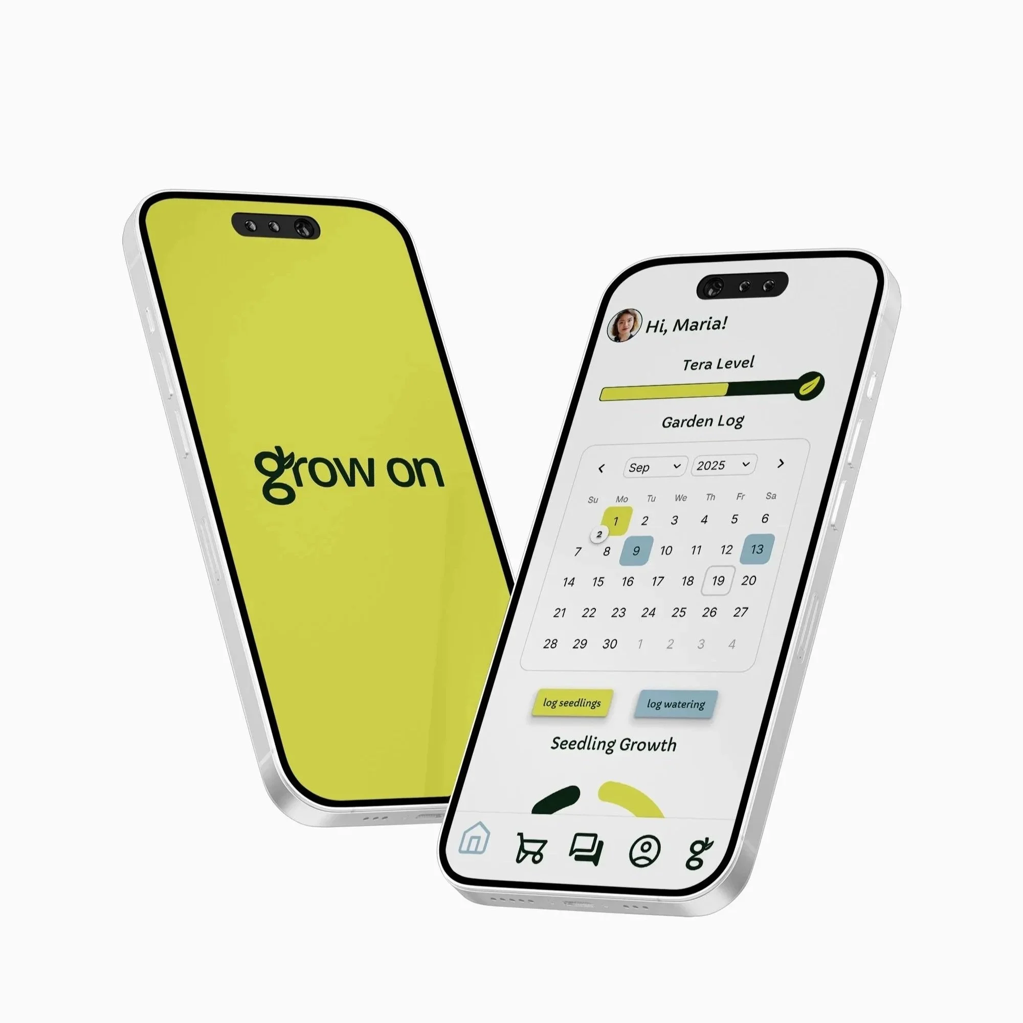 The app uses a calendar-based system to coordinate planting, care, and harvest cycles, alongside an AIchatbot that helps users navigate the platform, learn gardening basics, and find relevant information. A shared community pantry allows users to access fresh produce even if they are unable to garden directly. Grow On also includes a recipe generator based on available pantry items to encourage use of shared produce and reduce food waste. Sustainability metrics visualize collective impact—such as food shared and participation levels—reinforcing community engagement and long-term sustainability.